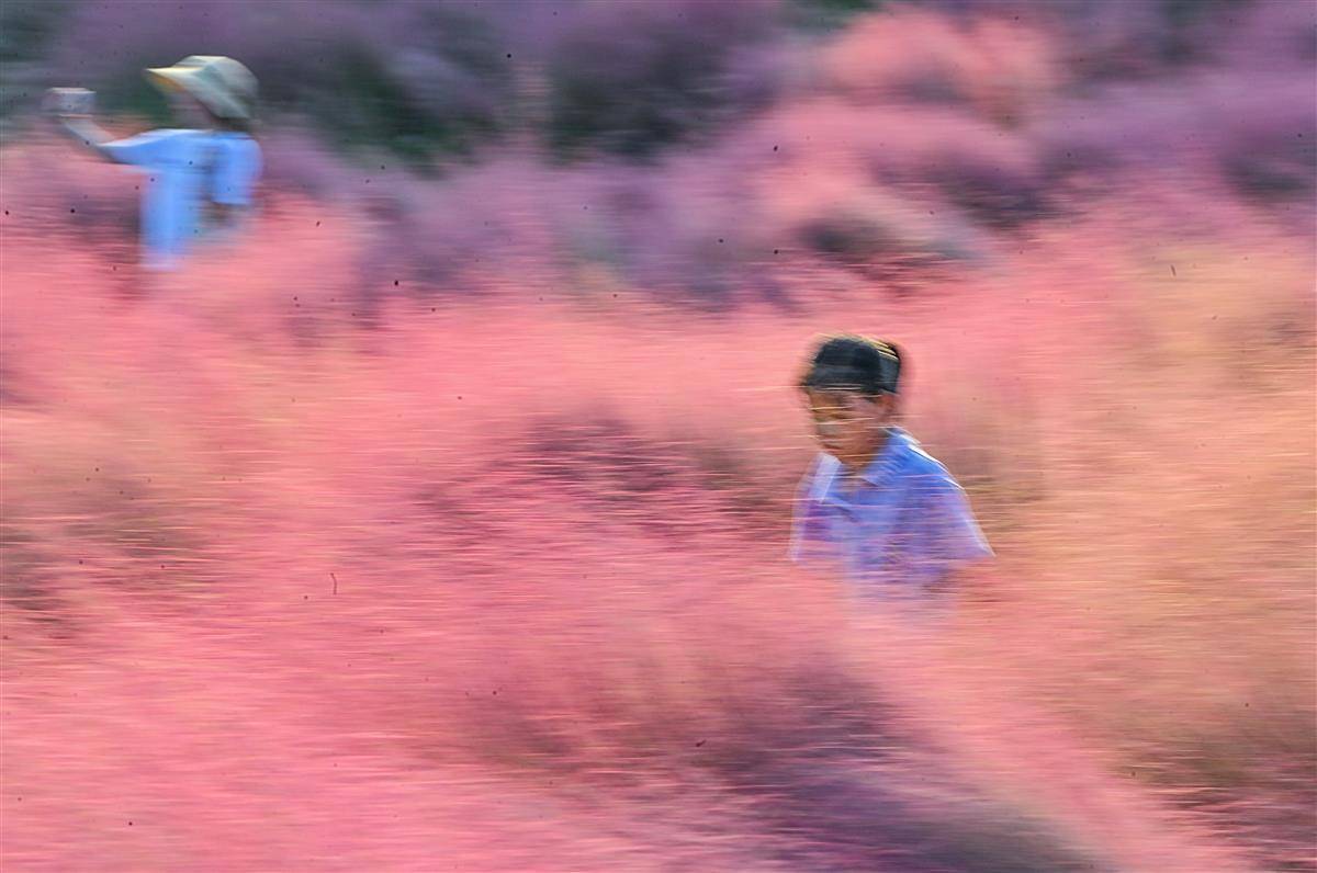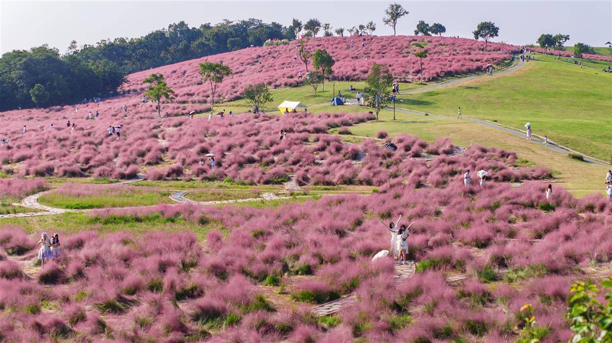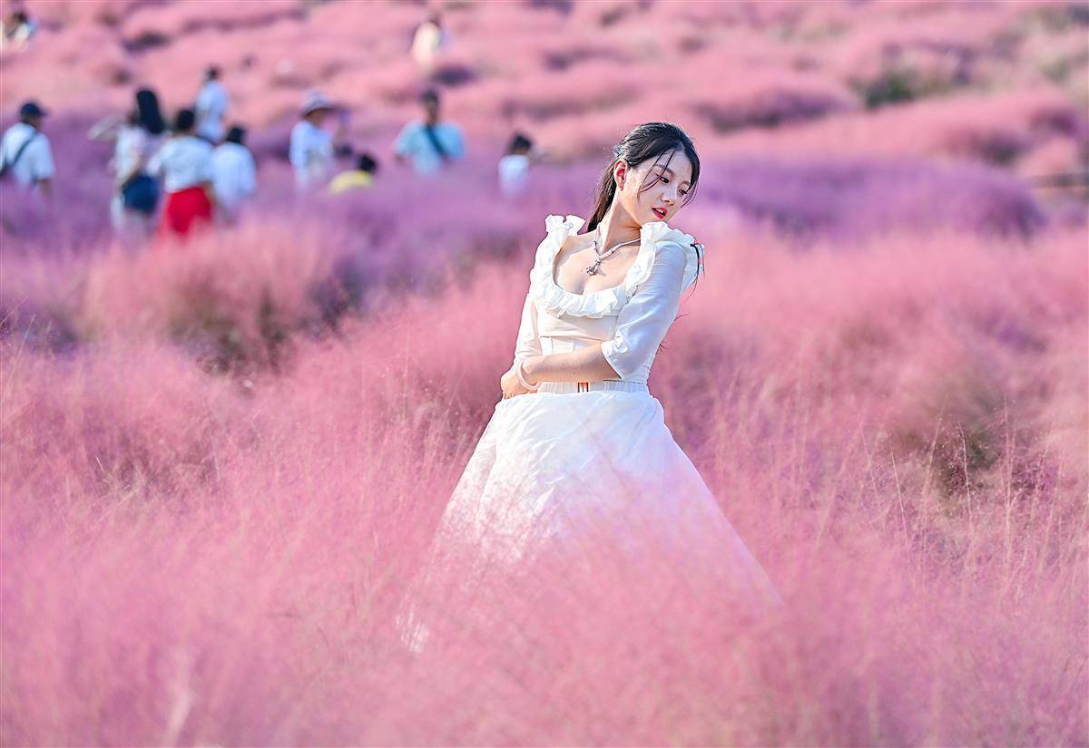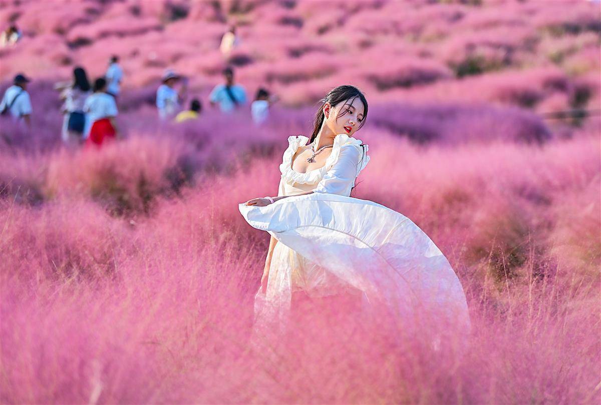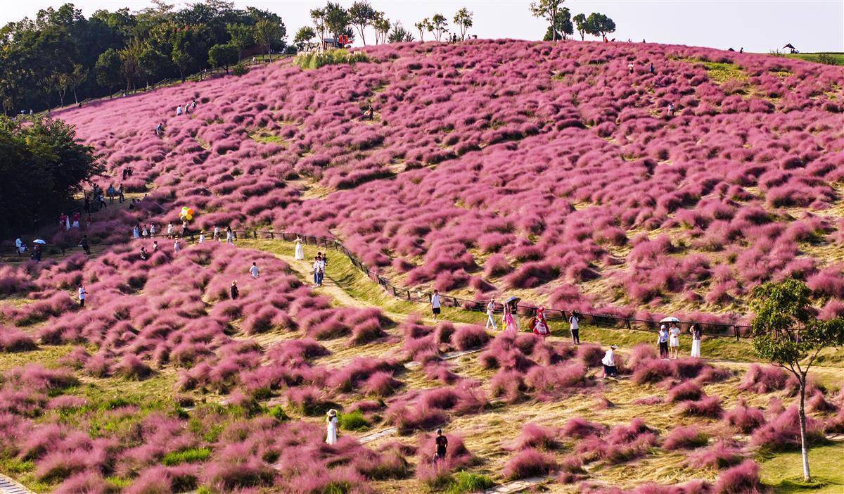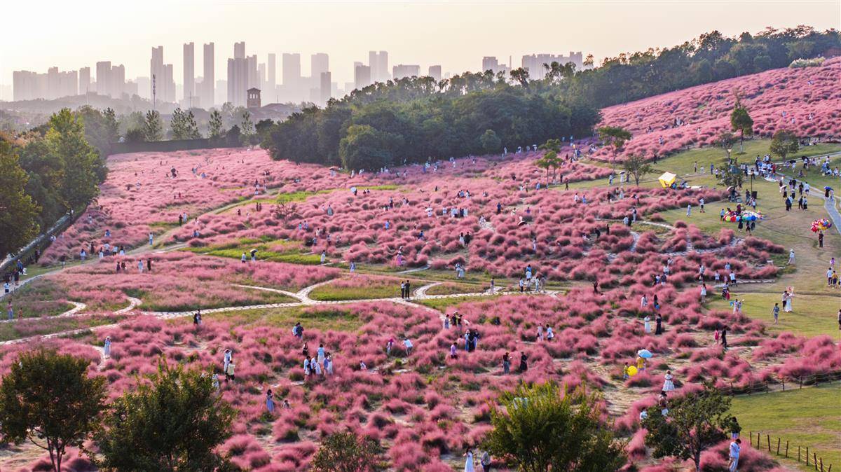 10月8日下午,许多市民游客抓住国庆长假最后一天,纷纷来到武汉光谷二妃山花海,欣赏日落美景,感受如云似雾的粉色浪漫。此处,被网友称为出片率100%的网红打卡地。(湖北日报全媒记者 朱熙勇 摄)