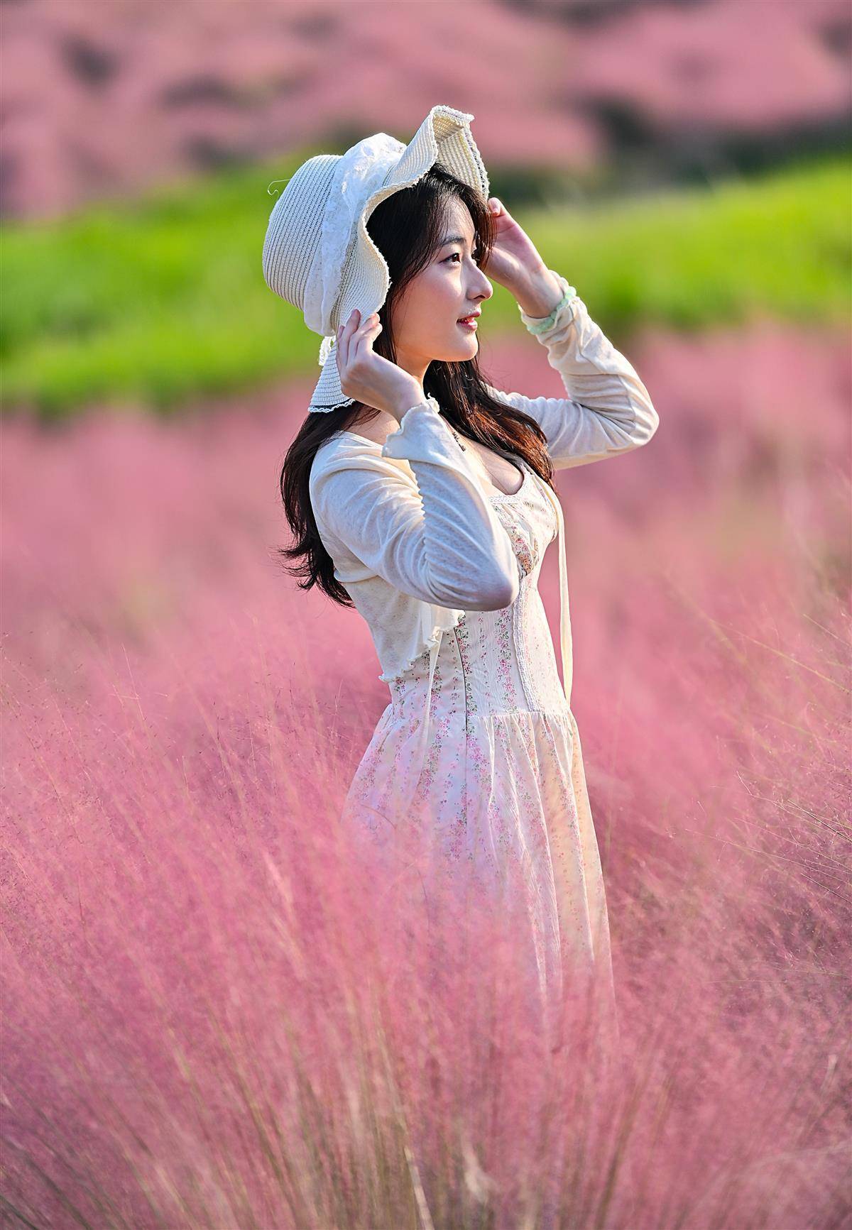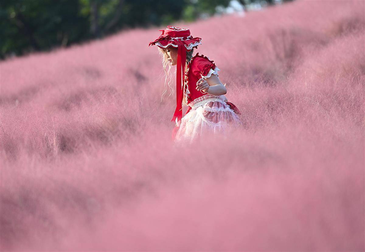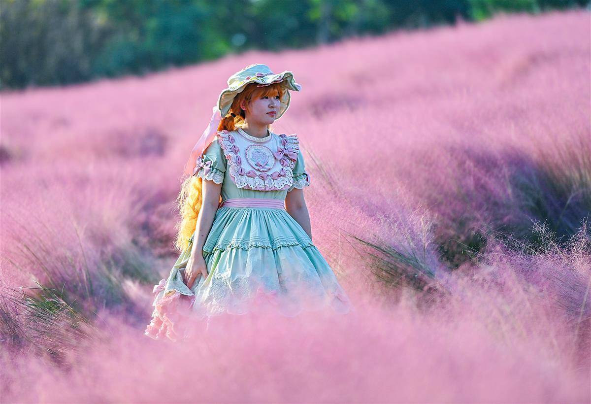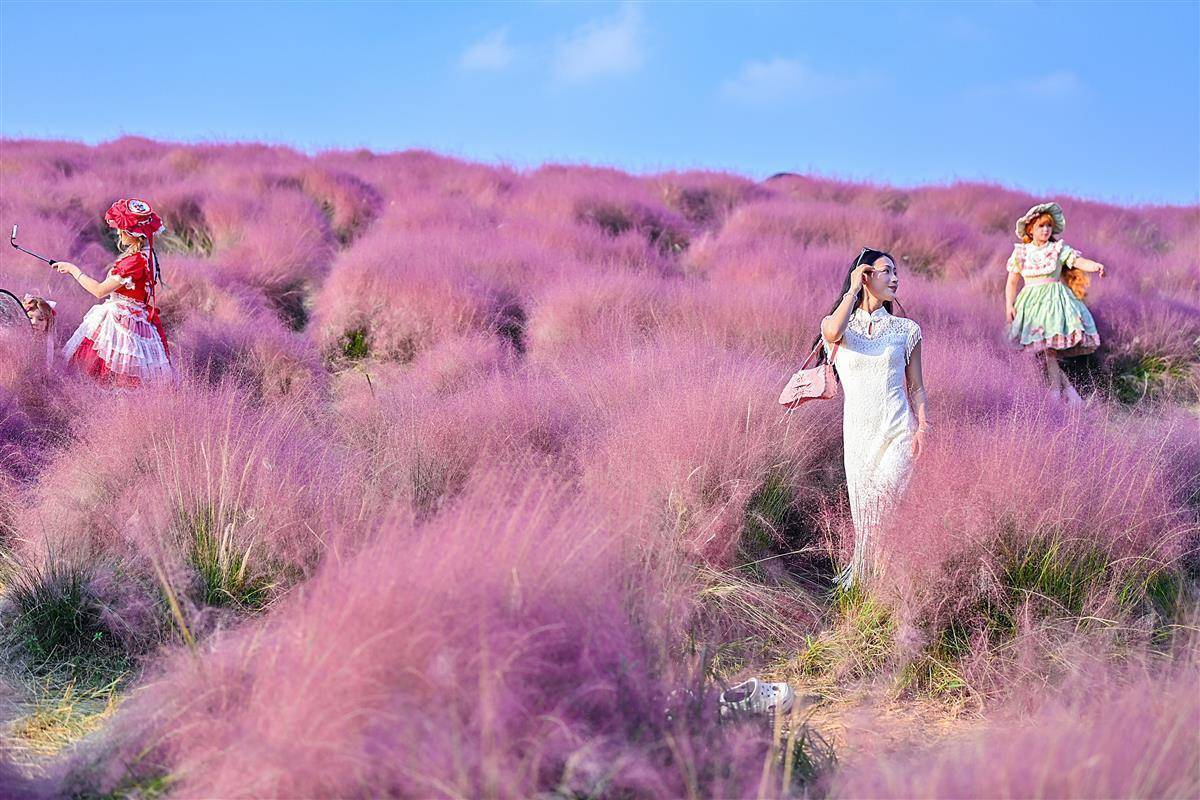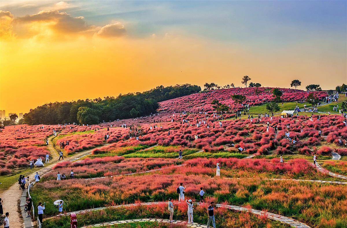 10月8日下午,许多市民游客抓住国庆长假最后一天,纷纷来到武汉光谷二妃山花海,欣赏日落美景,感受如云似雾的粉色浪漫。此处,被网友称为出片率100%的网红打卡地。(湖北日报全媒记者 朱熙勇 摄)